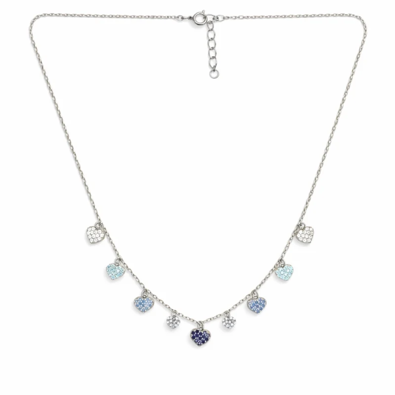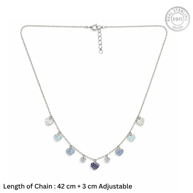 Blue Gradient Heart Charm Drop Necklace – 92.5 Sterling Silver Multi-Heart Choker with Ombre Crystals