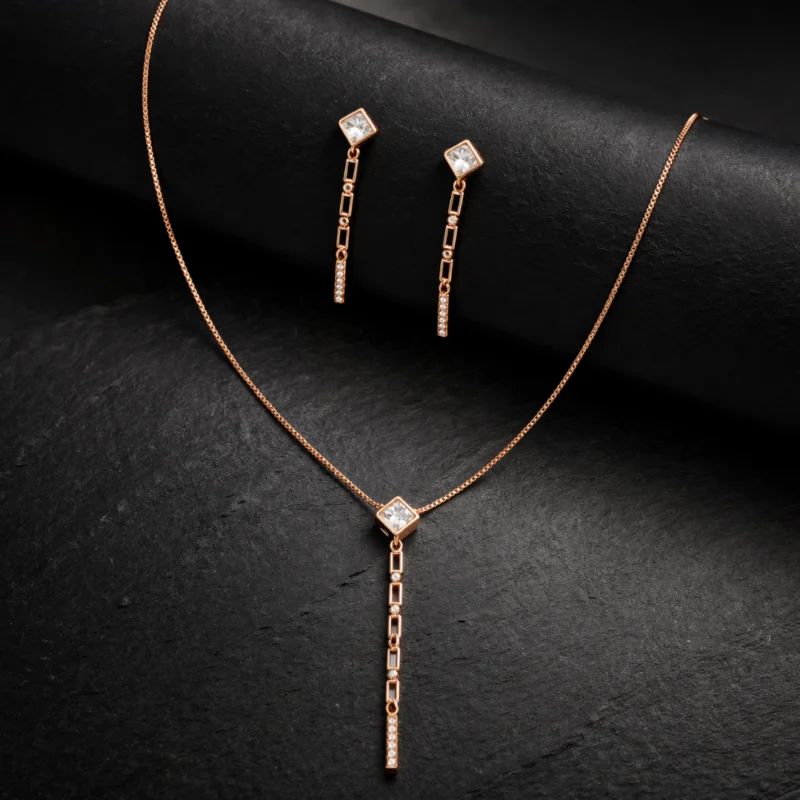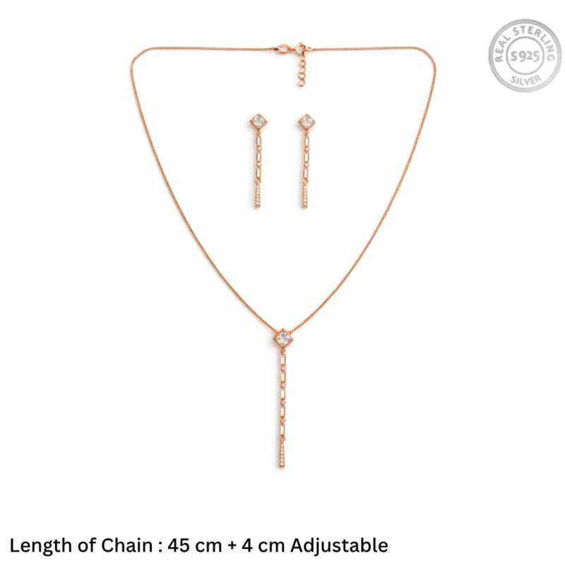 Architectural Princess-Cut Tassel Jewelry Set – Rose Gold Plated 92.5 Sterling Silver Lariat Necklace & Linear Drop Earrings