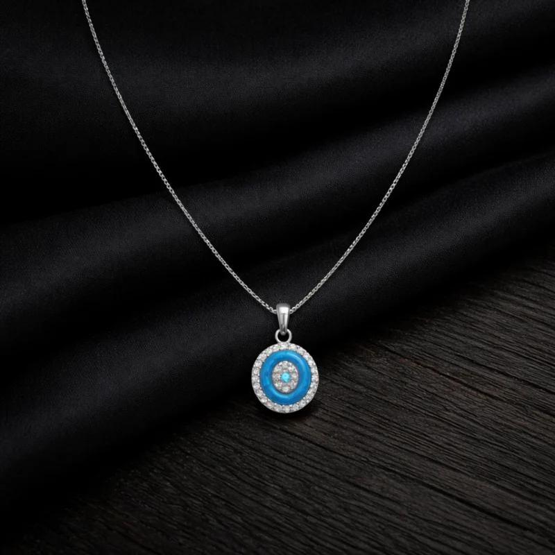 Cerulean Blue Halo Medallion Necklace – 92.5 Sterling Silver Oval Evil Eye Inspired Pendant with Vibrant Enamel and Crystal Accents