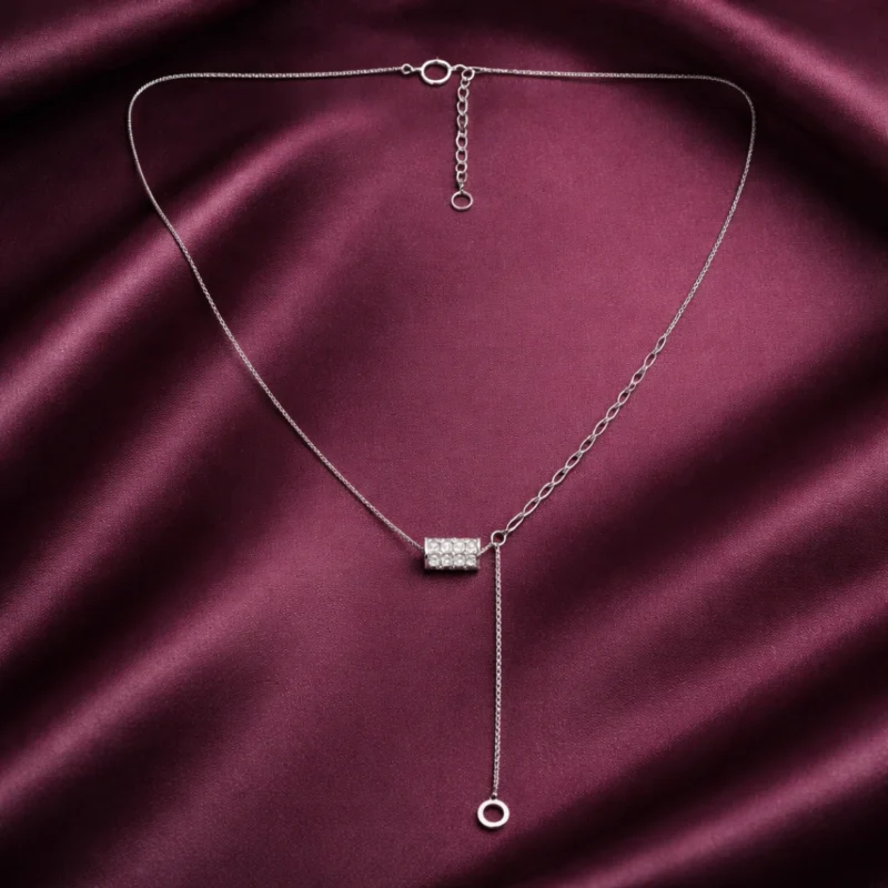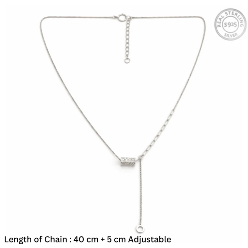 Asymmetric Pavé Barrel Lariat – 92.5 Sterling Silver Mixed Chain Y-Necklace with Shimmering Slider and Open Circle Charm