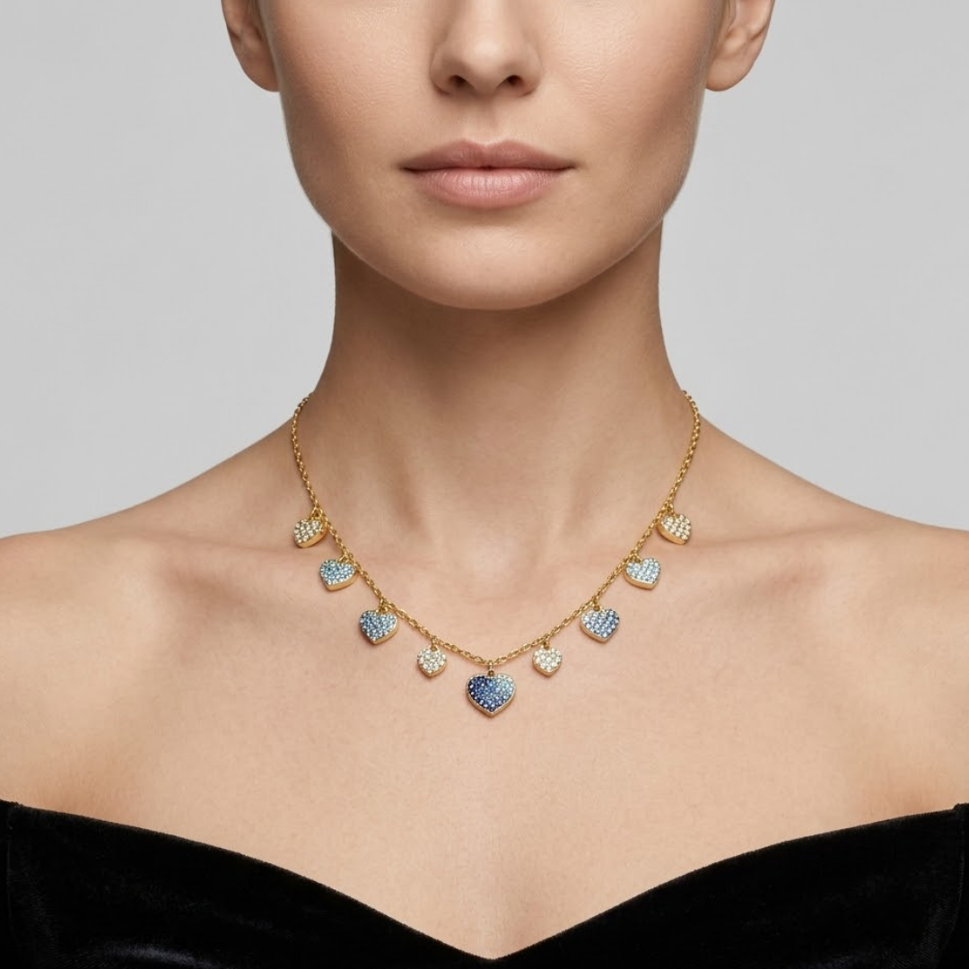 Infuse your look with the calming beauty of the ocean with our Blue Gradient Heart Charm Necklace. This playful yet elegant piece features a series of dangling heart charms, each meticulously pavé-set with shimmering crystals in a stunning ombre transition. The colors flow from a deep royal blue at the center to soft sky blue and brilliant white, creating a captivating visual rhythm.