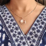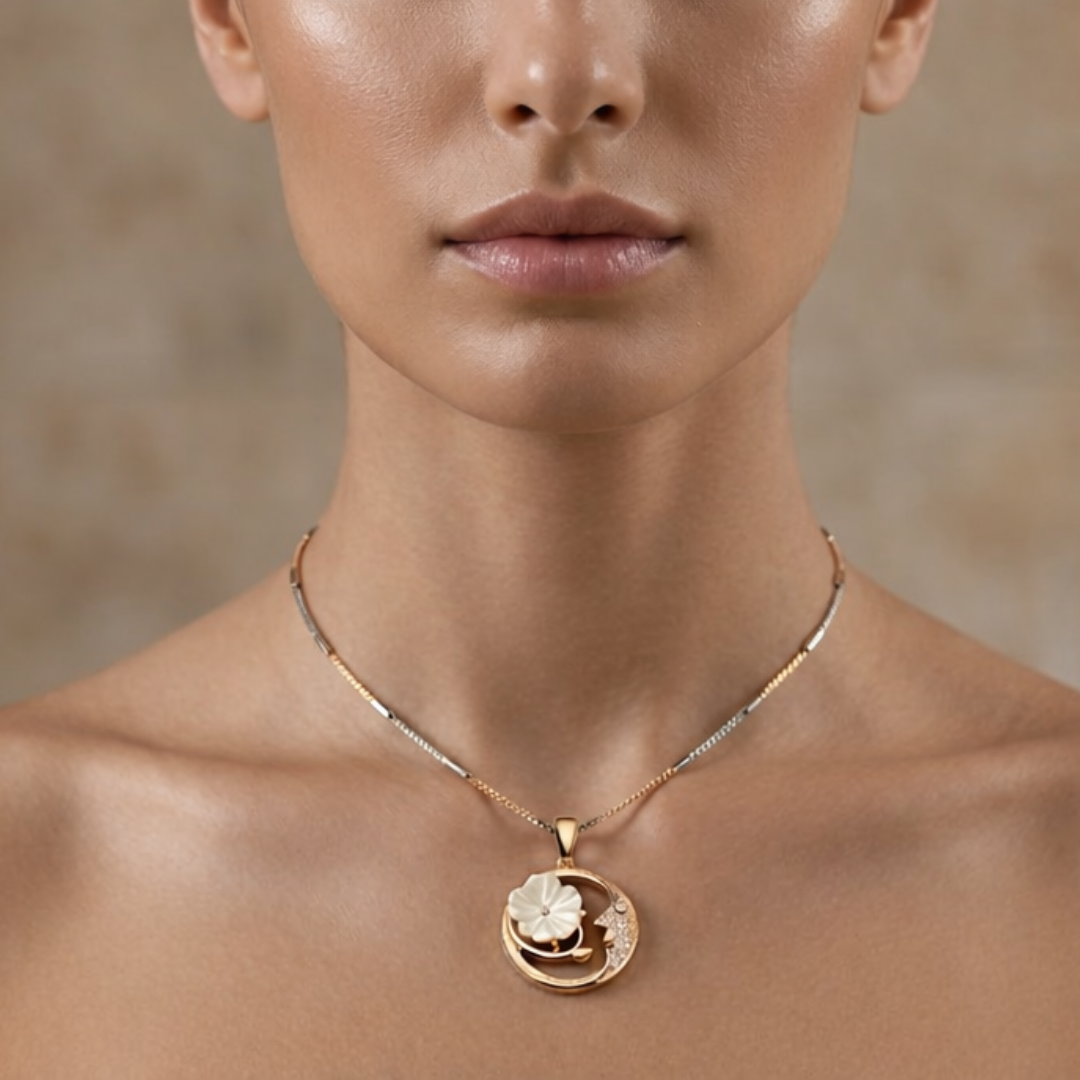 Step into a world of celestial beauty with our Moon and Flower Medallion Necklace. This intricately designed pendant features a shimmering crescent moon, delicately pavé-set with sparkling crystals, embracing a beautifully carved Mother of Pearl flower. The iridescent petals of the flower contrast stunningly against the warm, romantic glow of the rose gold finish, creating a piece that feels both vintage and modern.