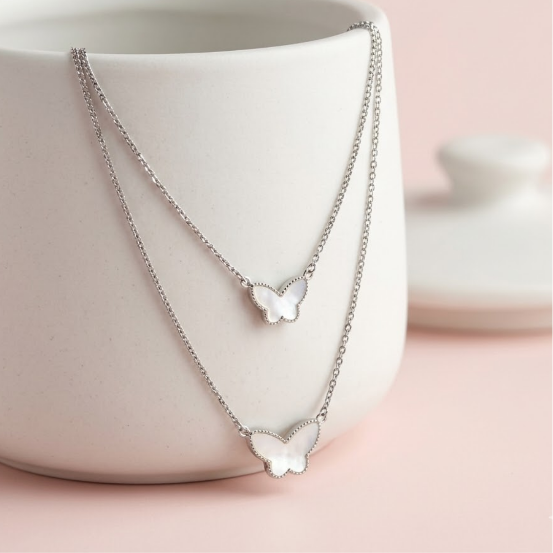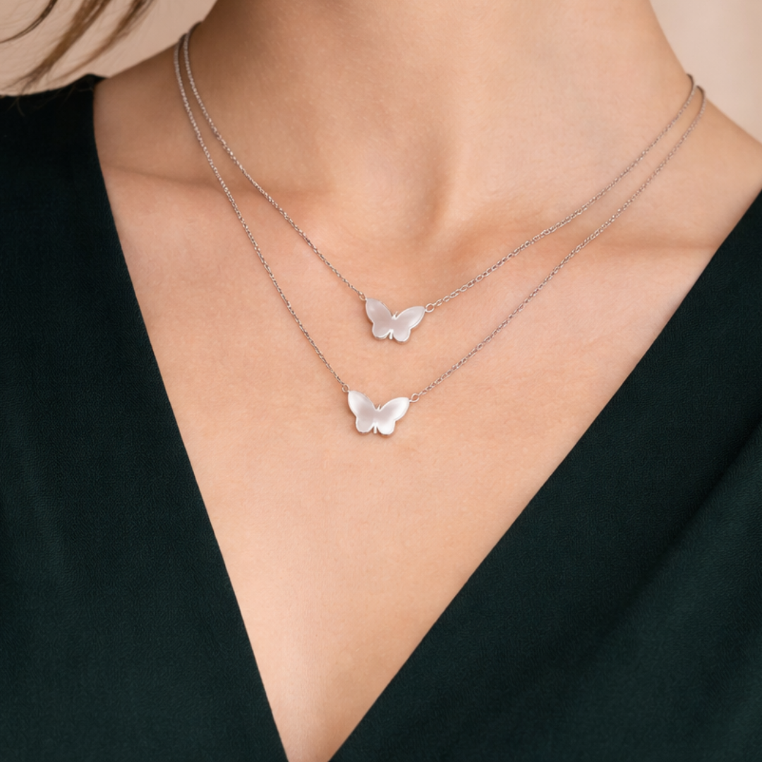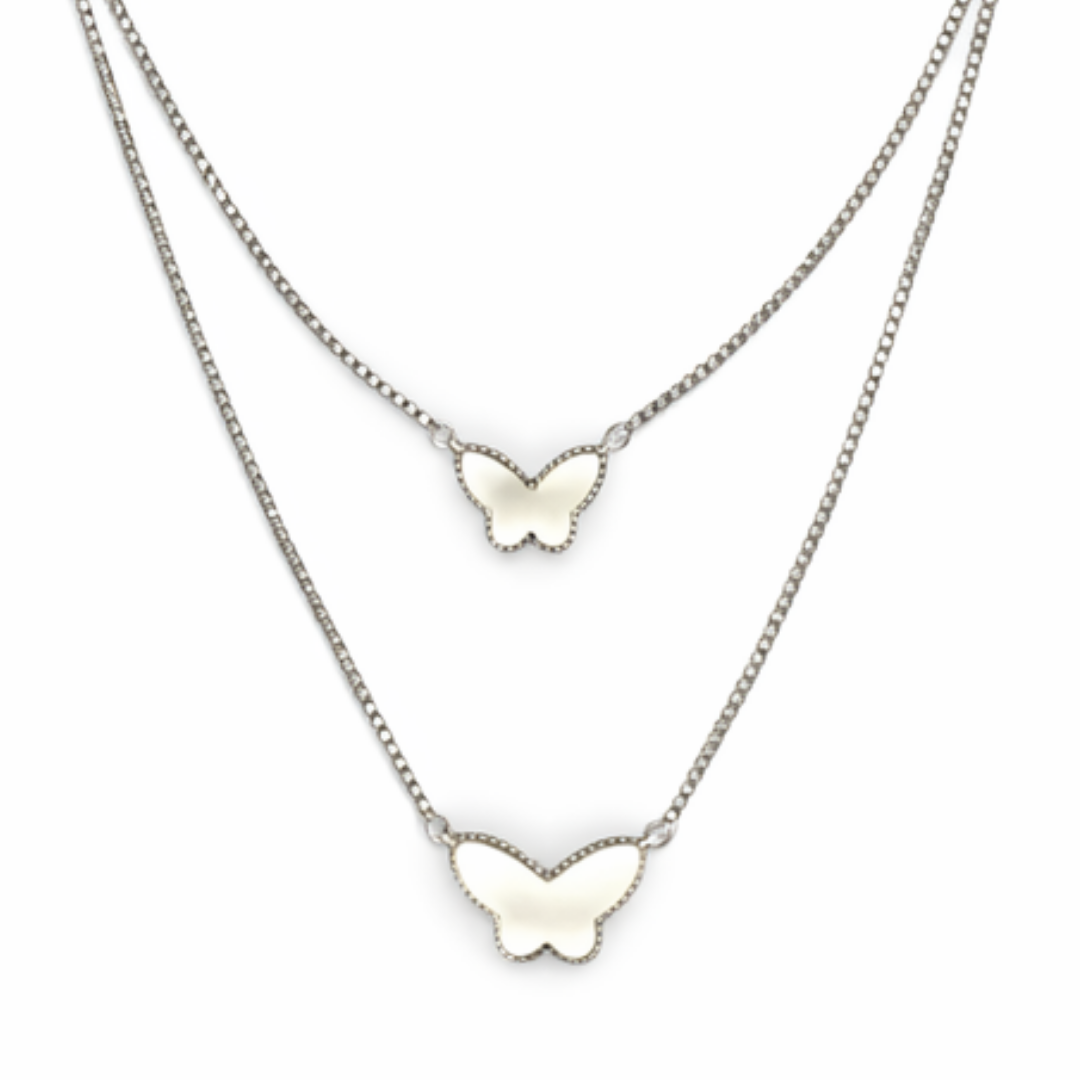 Embrace a look of effortless grace with our Mother of Pearl Butterfly Layered Necklace. This stunning double-strand piece features two delicate butterfly charms, each inlaid with genuine Mother of Pearl that shimmers with an iridescent glow. The wings are framed by a fine milgrain-beaded edge, adding a touch of vintage-inspired detail to a modern, whimsical design.