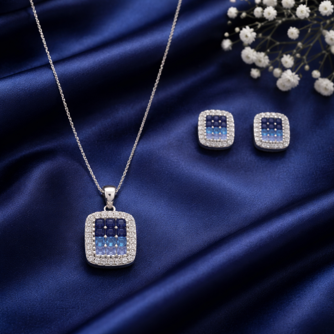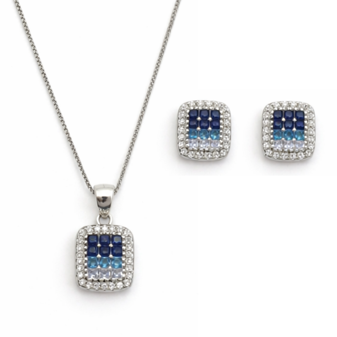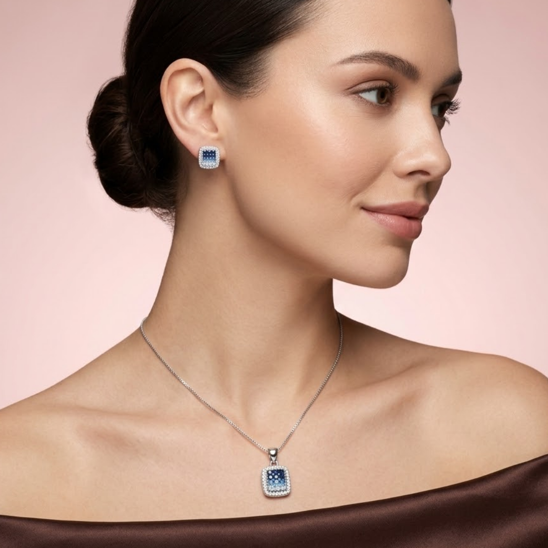 Dive into sophisticated style with our Geometric Blue Ombré Jewelry Set. This striking collection features a classic cushioned square silhouette with a vibrant, contemporary twist. The focal point of both the pendant and the matching stud earrings is a grid of channel-set crystals that transition beautifully through an ombré gradient—from deep midnight sapphire to a serene sky blue.