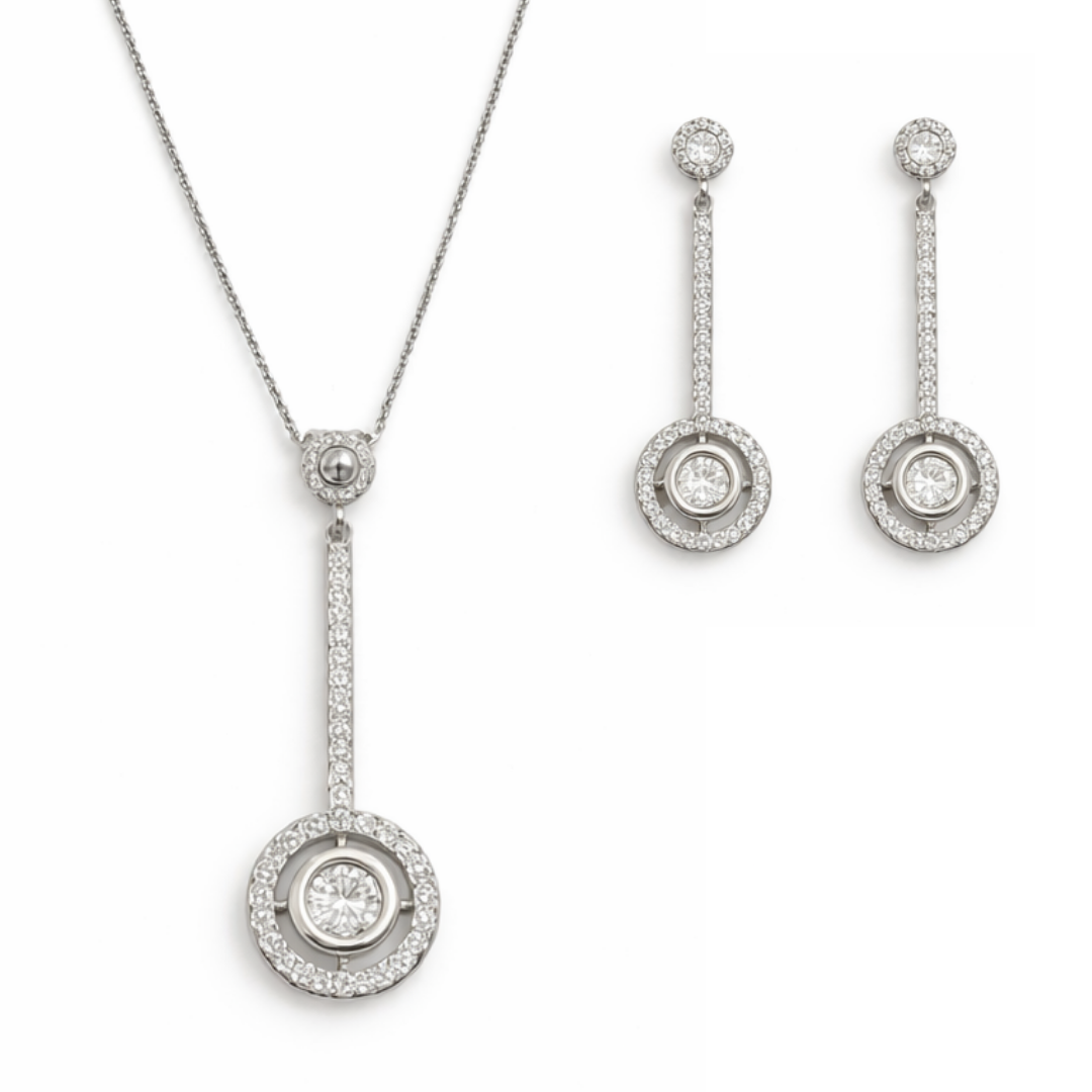 Geometric Halo Drop Jewelry Set – 92.5 Sterling Silver Vertical Bar Pendant & Matching Earrings with Shimmering Solitaire Accents