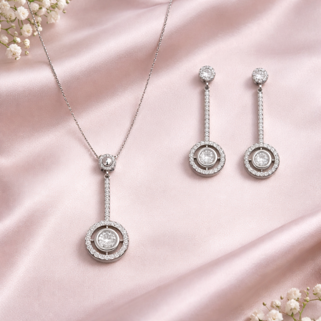 Crafted from premium 92.5 Sterling Silver with a high-polish finish, this set offers a refined and elongated silhouette that complements any neckline. The necklace is designed with a 42 cm chain and a 3 cm adjustable extension, ensuring it sits perfectly for both casual and formal occasions. Whether you’re looking for a standout bridal set or a sophisticated gift for a loved one, this jewelry set provides a timeless, high-fashion glow.
