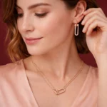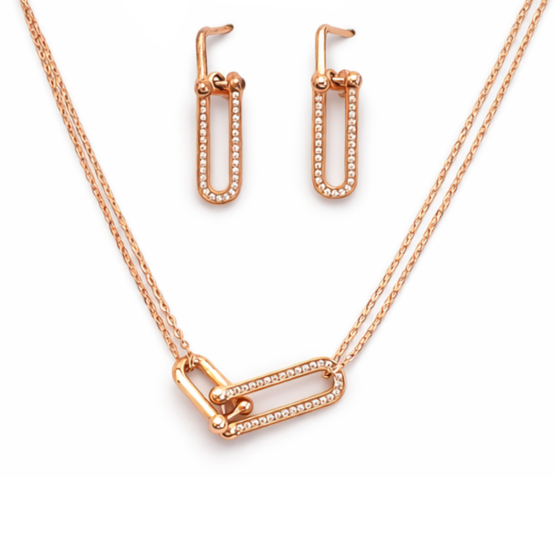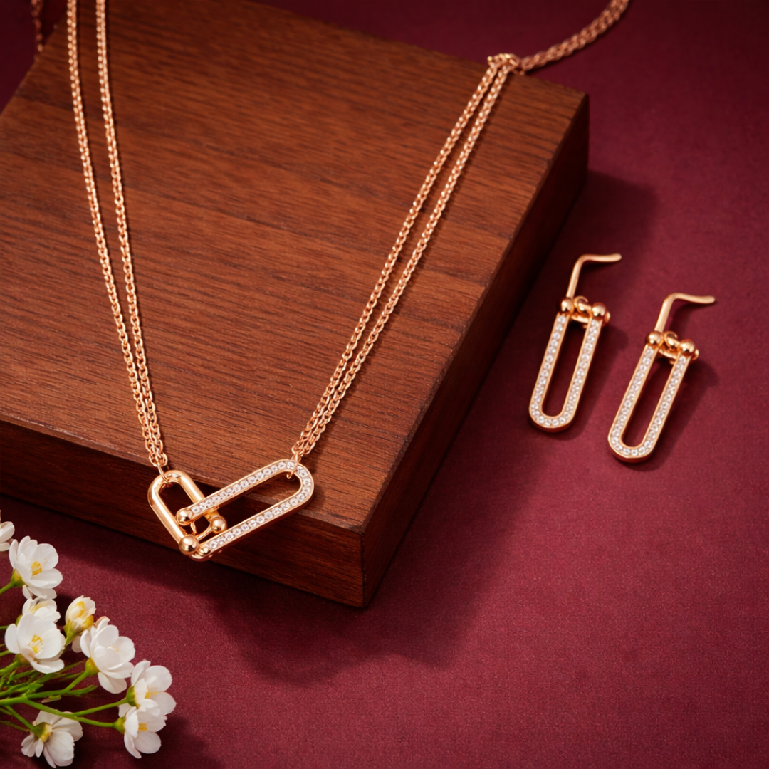 Redefine your style with our Industrial Chic Link Jewelry Set. Inspired by modern architectural lines, this set features a stunning interlocking U-link pendant and matching drop earrings. One half of each link is meticulously hand-set with a shimmering row of pavé crystals, creating a beautiful contrast between the high-polish rose gold surface and the brilliant sparkle of the stones.