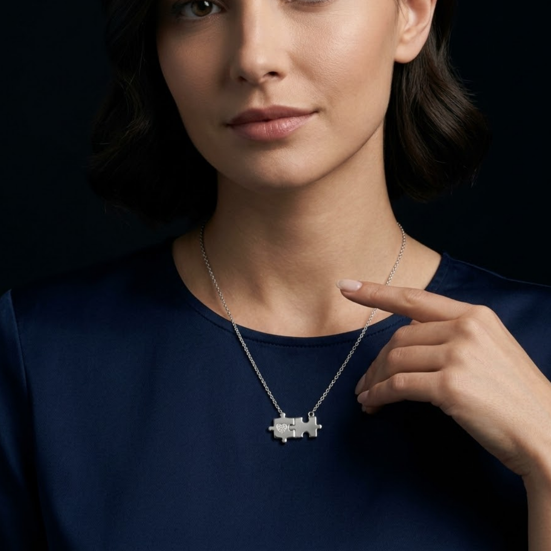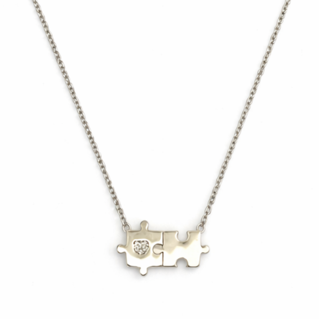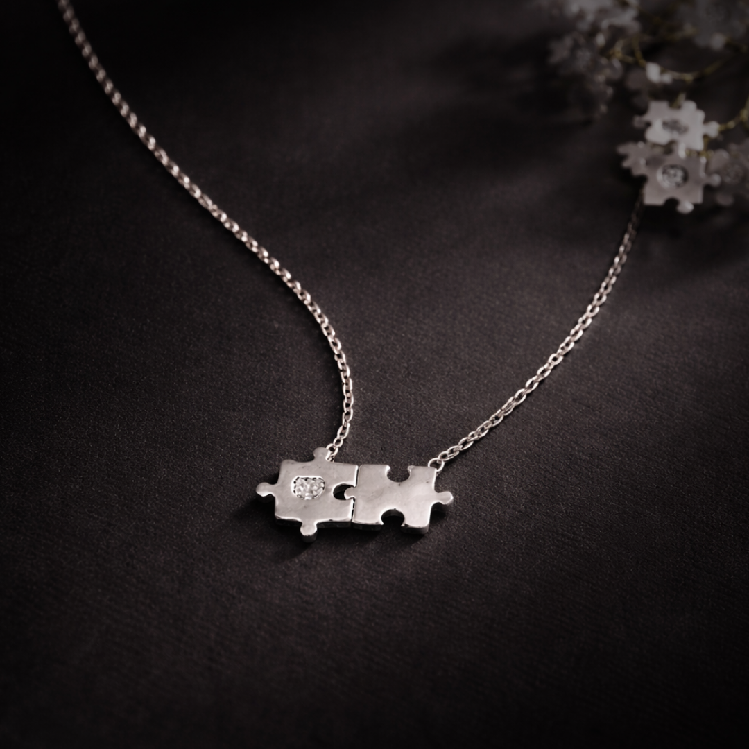 Celebrate the perfect fit with our Interlocked Puzzle Piece Heart Necklace. Crafted from high-quality 925 Sterling Silver, this elegant piece features two interlocking puzzle pieces that symbolize the unique bond between two individuals. One piece is delicately accented with a shimmering heart-shaped stone, adding a touch of brilliance to a design that speaks of connection, friendship, and love.