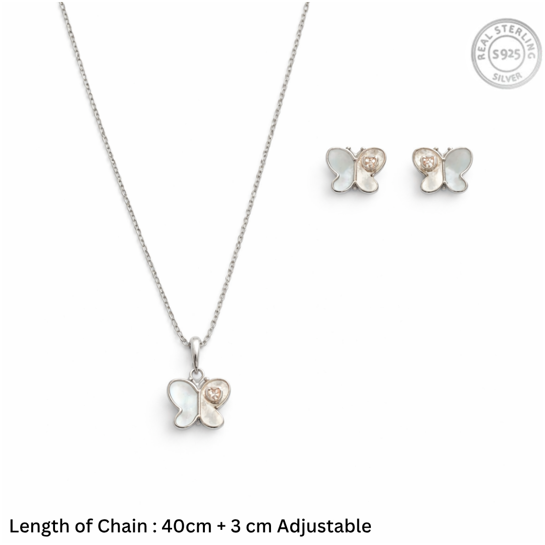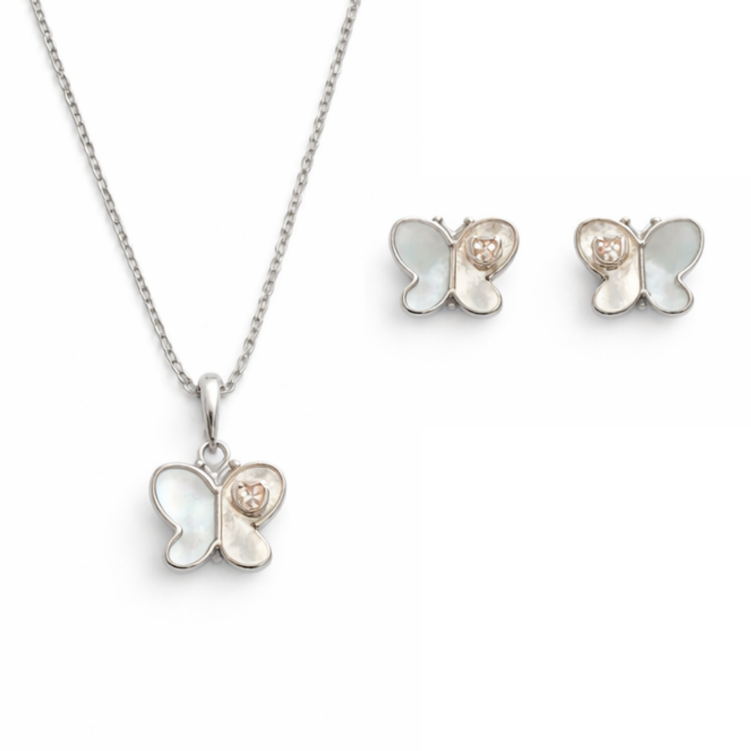 Mother of Pearl Butterfly Jewelry Set – 92.5 Sterling Silver Pendant Necklace & Stud Earrings with Rose Gold Accents