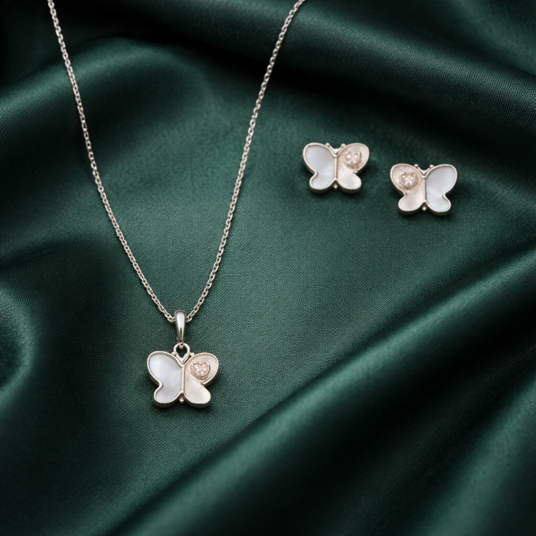 Be the first to review “Mother of Pearl Butterfly Jewelry Set – 92.5 Sterling Silver Pendant Necklace & Stud Earrings with Rose Gold Accents” Cancel reply