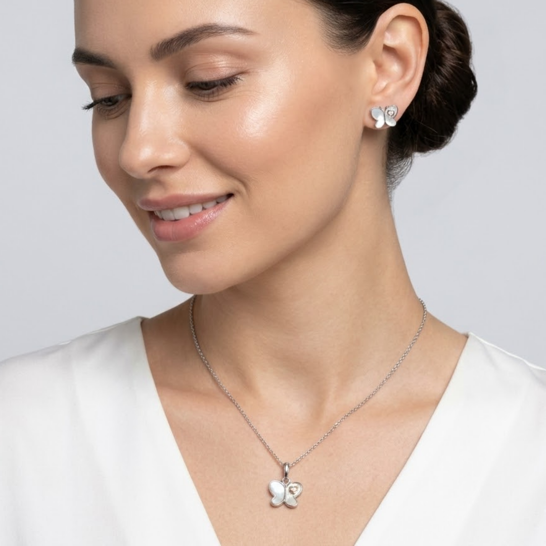 Embrace the grace and transformation symbolized by the butterfly with our stunning Mother of Pearl Butterfly Jewelry Set. This coordinated collection features a dainty pendant necklace and matching stud earrings, each showcasing butterfly wings inlaid with genuine Mother of Pearl. The iridescent shell reflects a soft, rainbow-like glow, while a delicate rose gold-plated heart detail adds a warm, romantic touch to the wing.