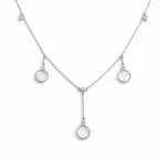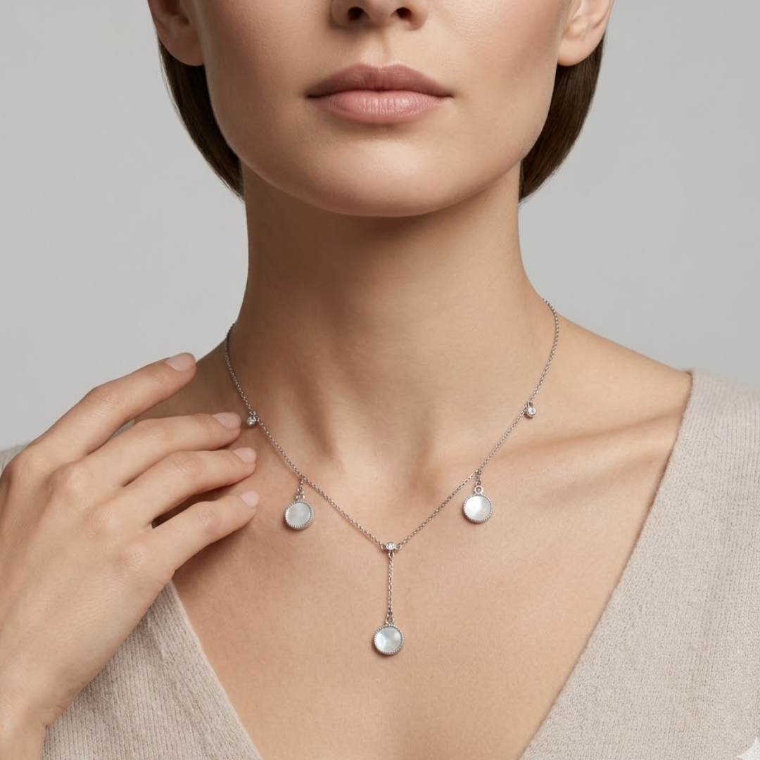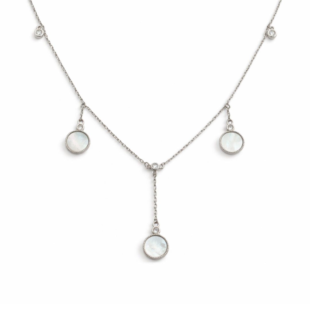 Infuse your jewelry collection with the soft, iridescent beauty of our Mother of Pearl Dreamcatcher Lariat. This sophisticated Y-shaped necklace features five delicate circular stations, with the three primary dangles showcasing genuine Mother of Pearl inlays. Each shell disc is framed by a finely textured silver border and topped with a brilliant pavé-set crystal, creating a harmonious blend of natural luster and modern sparkle.