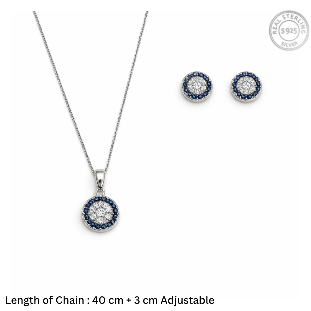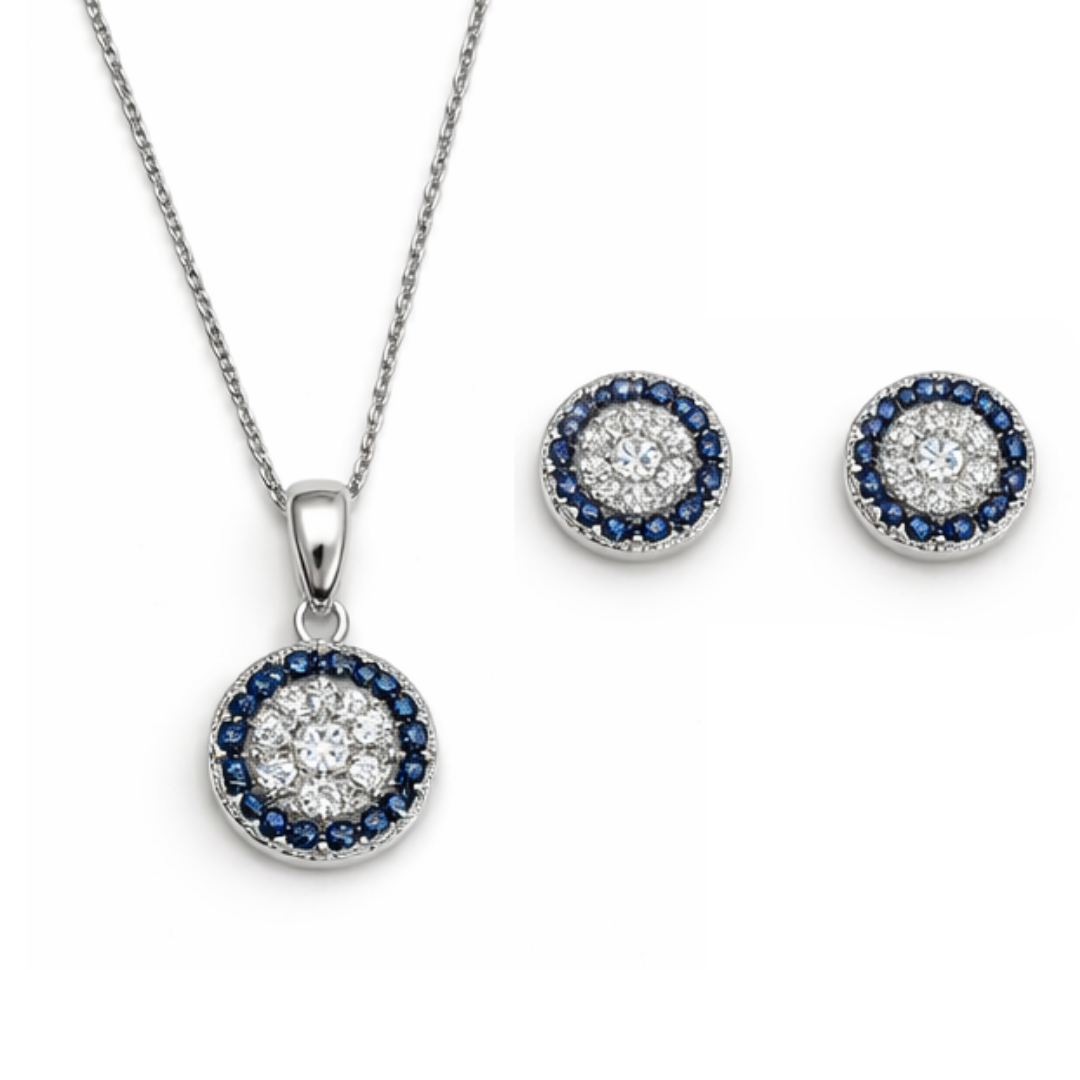 Royal Blue Sapphire Halo Jewelry Set – 92.5 Sterling Silver Round Medallion Necklace & Stud Earrings with Sparkling Crystals
