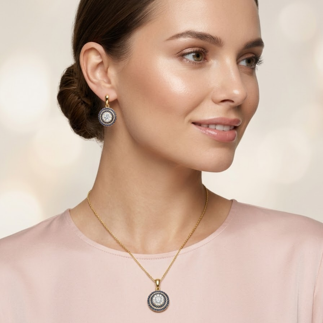 Step into elegance with our Royal Blue Sapphire Halo Jewelry Set. This exquisite collection features a perfectly coordinated pendant necklace and matching stud earrings, each showcasing a brilliant cluster of clear crystals at the center. The focal point is surrounded by a stunning halo of deep sapphire-blue stones, all set within a delicately textured silver border for a vintage-inspired, regal look.