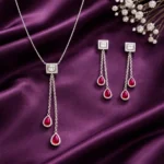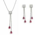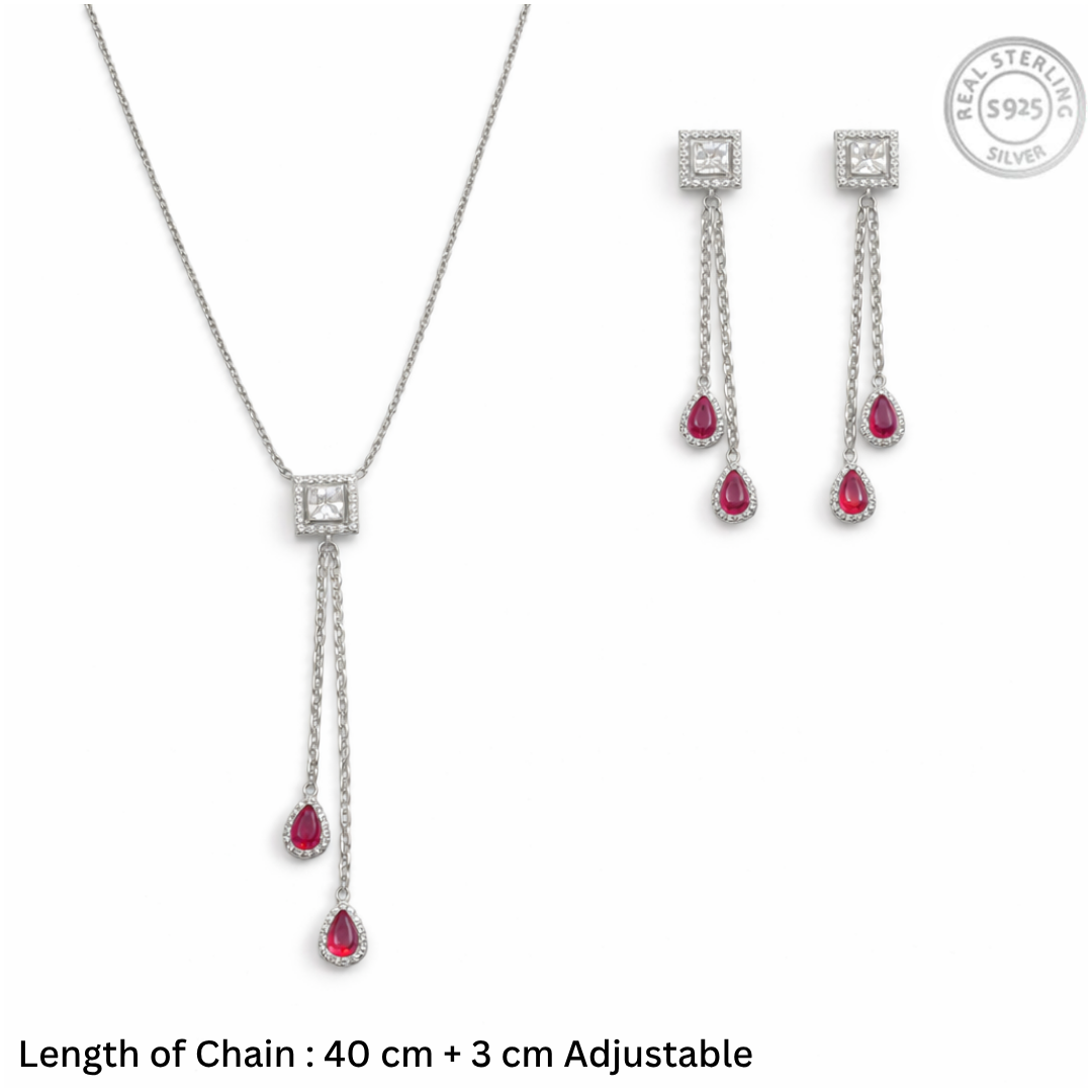 Ruby Red Teardrop Tassel Jewelry Set – 92.5 Sterling Silver Square Halo Lariat Necklace & Dangle Earrings