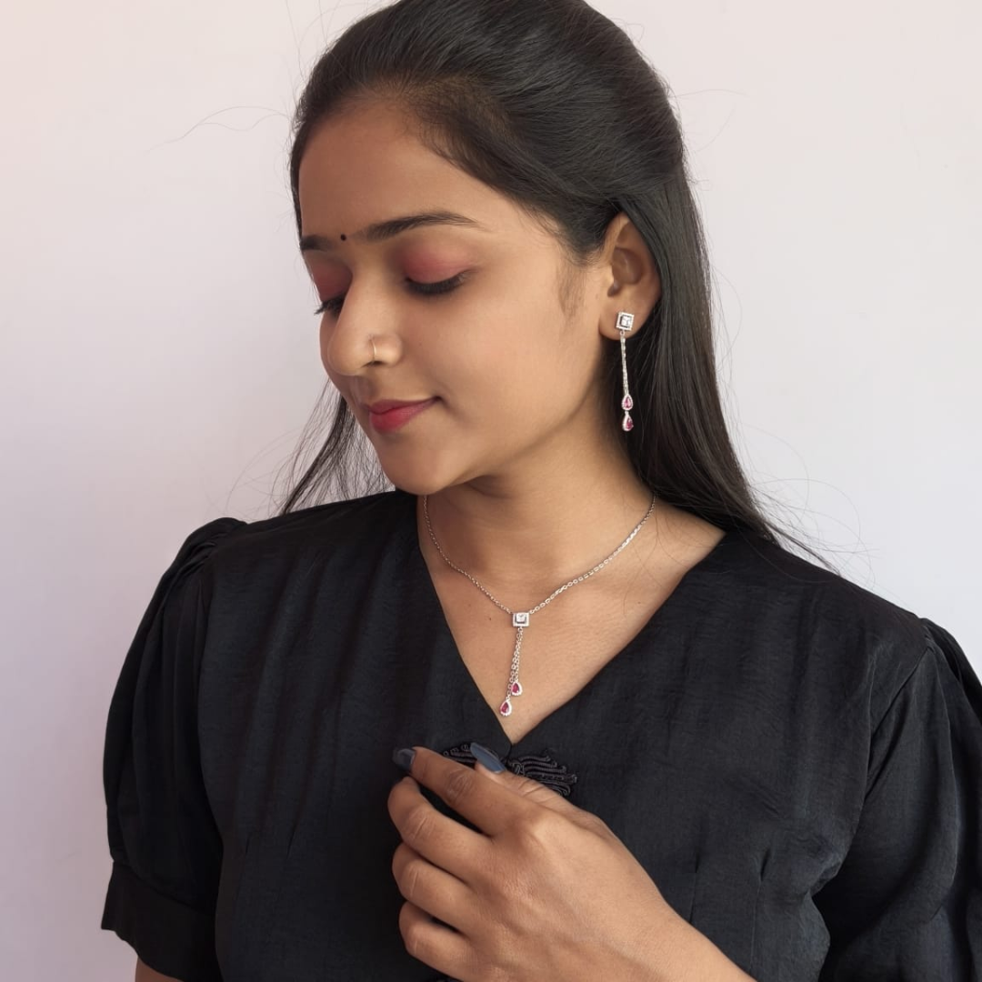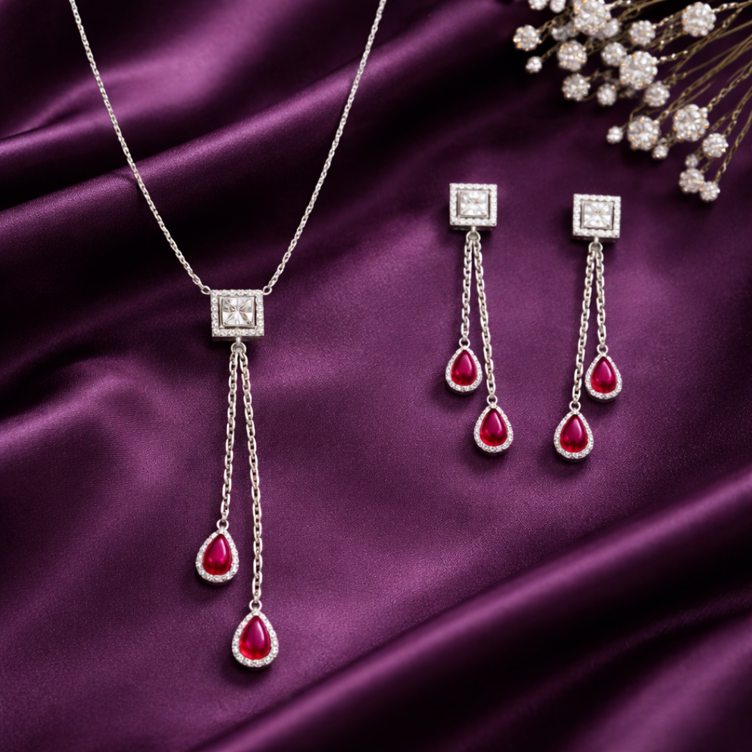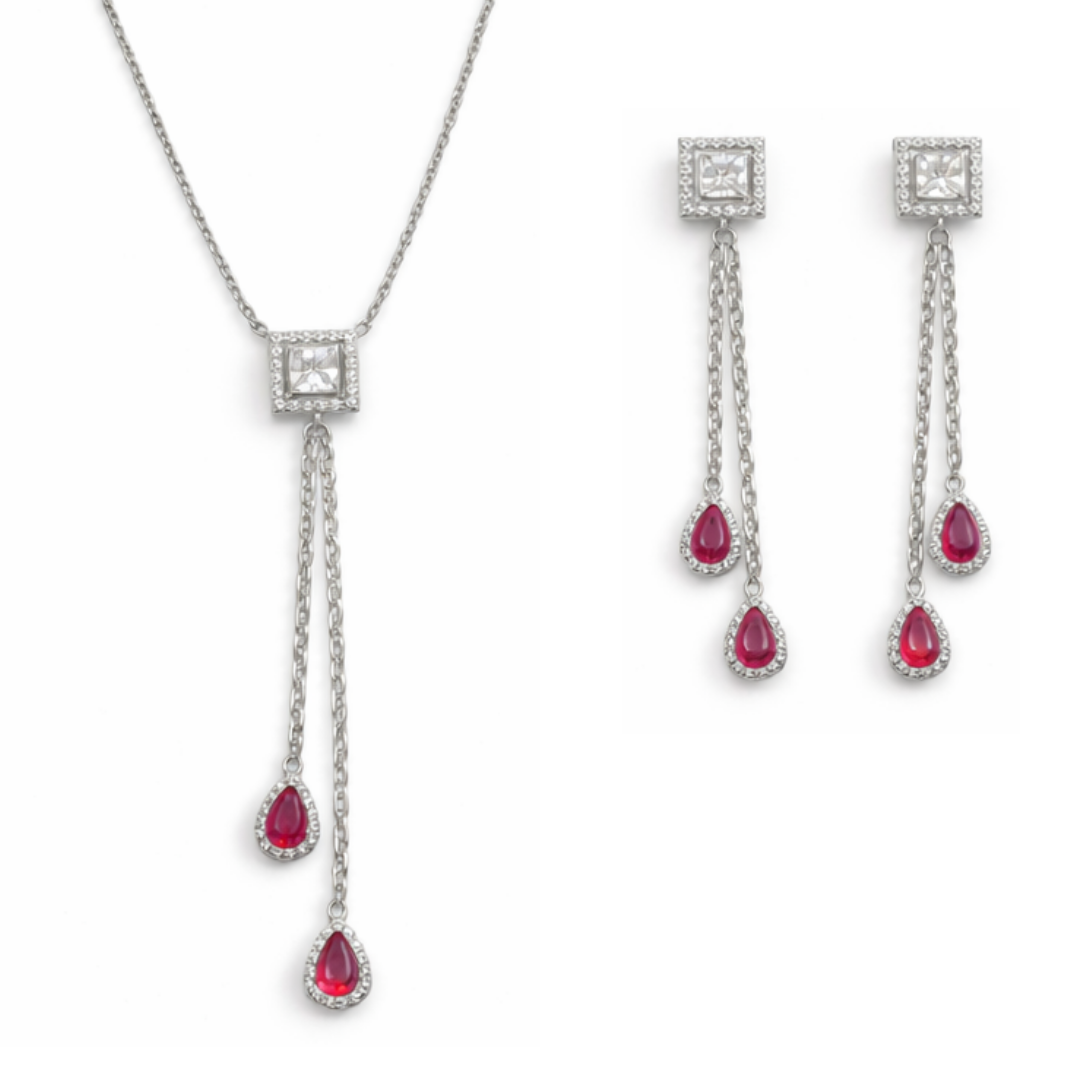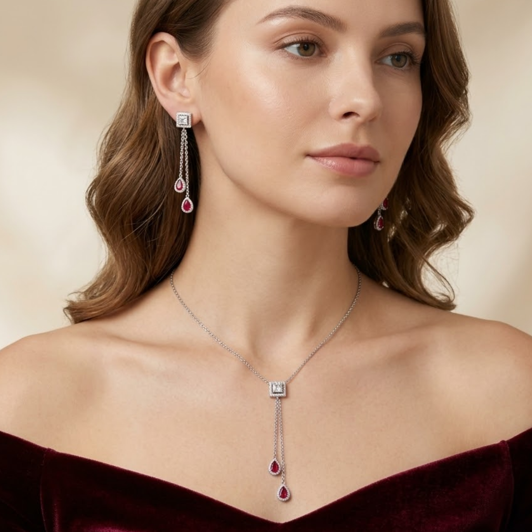 Infuse your look with a touch of drama and elegance with our Ruby Red Teardrop Tassel Jewelry Set. This stunning ensemble features a sophisticated architectural design, anchored by a brilliant princess-cut square halo at the center. Suspended from the pendant and matching earrings are tiered silver chains, each finished with a vibrant pear-cut ruby-red crystal that sways gracefully with your every move.