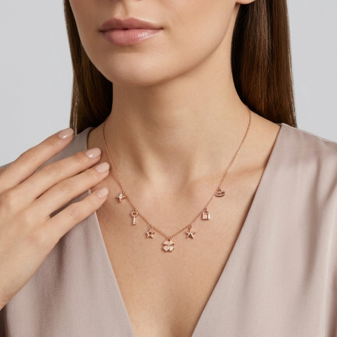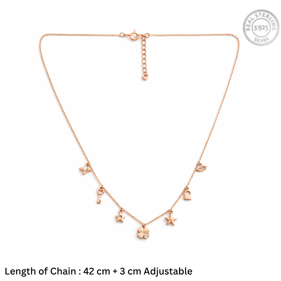 Crafted from authentic 92.5 Sterling Silver and finished with a warm, luxurious rose gold plating, this necklace offers a soft and romantic aesthetic. The 42 cm chain with a 3 cm adjustable extension provides a versatile fit, perfect for wearing as a high-sitting statement piece or layering with longer pendants for a trendy, personalized look. Whether gifted as a token of good fortune or worn as a daily reminder of life’s little joys, this multi-charm necklace is a high-fashion essential for the modern dreamer.
