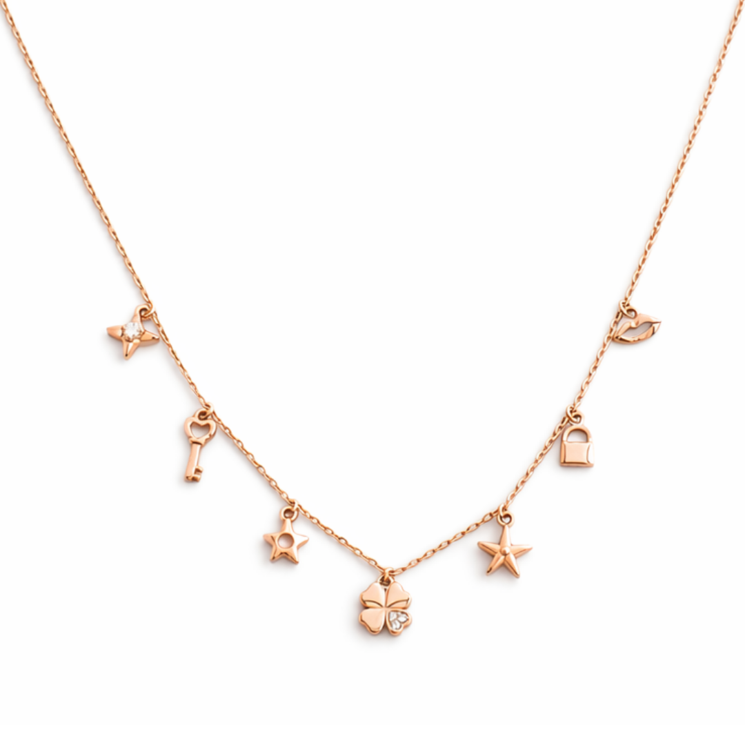 Carry a touch of enchantment wherever you go with our Whimsical Lucky Charm Station Necklace. This delightful rose gold piece features seven unique, high-polish charms delicately spaced along a slender chain. The design is anchored by a central four-leaf clover accented with a single shimmering crystal, surrounded by a curated mix of charms including a vintage-style key, celestial stars, a modern padlock, and a playful lip motif.